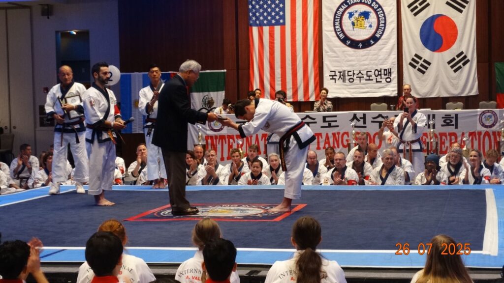 Uno de los momentos más emotivos del campeonato se vivió el sábado 26 de julio, cuando el maestro Tomás Marcos Gómez fue nombrado miembro del Salón de la Fama 2025 de la International Tang Soo Do Federation. El reconocimiento fue entregado por el Gran Maestro Chun Sik Kim, fundador de la federación, en una ceremonia que destacó la trayectoria y el aporte del maestro al desarrollo de esta arte marcial en Chile.
